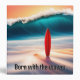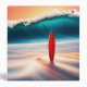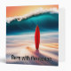 Upright orange surfboard on a sunrise beach with a big ocean wave and surfer quote.