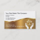 Upscale real estate title company business cards with classy simulated gold metallic design elements digitally printed on the front including gold looking house with helping hands symbol. Customize the text, background color or layout as you like. Designed as a business card template related to real estate, title services, or title insurance.