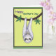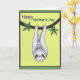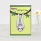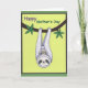 On the front of the card a larger, calm forest creature hangs upside down from a gently curving branch, its pale violet-and-white fluffy fur wrapping around a smaller companion like a soft hug ❤️. The little one peeks out with wide, content eyes and a bright smile, and the matching facial markings on both faces make their closeness feel quietly affectionate. A sturdy dark-brown branch cuts diagonally across the upper area, dotted with stylized emerald leaves that suggest a leafy canopy. Behind them, a luminous lime-green background adds a fresh, sunny look, while a deeper forest-green border frames the scene. Near the top, the word “Happy” sits above the rest of the message in warm purple text. Just below it, “Mother’s Day” appears in green, centered and easy to read, with the lettering standing out clearly against the light background 🌼. The parent’s relaxed expression and the child’s delighted grin create a tender, friendly connection as they cuddle midair. The dark green border forms a neat frame around the bright green field and the branch with clustered leaves.