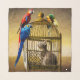 This is a great picture of a cute little kitty cat on the wrong side of the cage. With a group of beautiful bright birds looking in to check him out. Surrealism at its best.