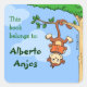 Happy cute monkey hanging upside down by its tail on a tree branch, reading a book. This sweet monkey who loves books is looking forward to decorate your kids books. Customize it with your own desired name. Children Ex libris / bookplate / booklabel