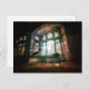 Urban decay photo showing huge stained glass windows inside an old church building with the silhouette of a cat playing on an abandoned table.