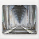 Heavy metal steel beams and girders combine with extreme structural engineering in this bridge foundation. Color photo captures the cold and hard steel surfaces in shades of grey, and the interesting perspective gives the illusion of entering a tunnel or chute.