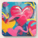 This vibrant graffiti artwork captures the essence of love with an explosion of colorful hearts against a dynamic blue background. The overlapping shades of pink, yellow, red, and orange hearts, combined with splashes and drips of paint, create a lively and passionate scene, embodying the spirit of street art and romance.