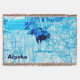 A monotone blue image of a cow moose in an urban setting. Customizable text reading "Alaska" also appears. Moose are year-round residents in many Alaskan communities. Here in Anchorage there are about 1500 animals, along with wolves, brown bears and other wildlife.They are usually well-behaved. They often cross streets at the crosswalks after waiting for a walk signal. From a photo of a moose which wandered through my yard.