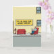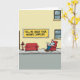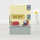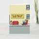 This greeting card shows an urban street scene with a pale building front and a large yellow banner stretching across the upper area. The banner text reads “TELL ME ABOUT YOUR MOTHER COMPLEX” in dark lettering that stands out against the warm yellow. Below it, a gray sidewalk becomes an outdoor sitting spot, where a small crimson sofa faces a matching armchair as if set up for a private talk in public. A balding man sits back in the armchair reading a newspaper, his relaxed posture adding a quietly intimate, almost confiding mood ❤️. Nearby, a red fire hydrant echoes the rich red of the furniture, tying the scene together with a friendly warmth. The lighting is bright and even, keeping edges sharp and colors flat, with the reds and yellows drawing the eye like a shared secret between friends 🌼. The sofa and armchair sit side by side on the sidewalk beneath the yellow banner, with the red hydrant positioned close to the seating.
