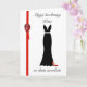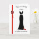 A Polish birthday card featuring an evening gown and red stilettos, decorated with red ribbon and a ruby gem.