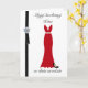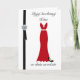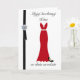 A Polish birthday card featuring a red evening gown and black stilettos, decorated with black ribbon and a gem.
