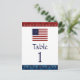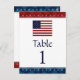 Beautiful American flag patriotic or military themed party table number cards. These vibrant colored patriotic table number cards are a wonderful addition to any patriotic themed party or military party. The text is in template form on this page ready for you to add your table numbers. The design features an American flag on a white background, in colors of red, white and blue on a white background. . The top and bottom of card are red and blue with white stars. A truly wonderful addition to your patriotic party tables! This design is a match to many of our patriotic and military themed invitations we sell in our store. For more styles and designs of patriotic or military cards, invites, stamps, and gift items, please visit our store!