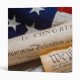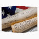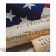 Copies of the Declaration of Independence and US Constitution in rolled up scrolls with a vintage American flag