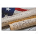 Copies of the Declaration of Independence and US Constitution in rolled up scrolls with a vintage American flag