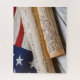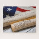 Copies of the Declaration of Independence and US Constitution in rolled up scrolls with a vintage American flag