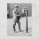 This is a vintage photo of a US Mailman collecting mail from a sidewalk postal box. The mailman is wearing gaiters because he rides a motorcycle on his route.
