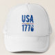 USA and 1776 in a unique font is printed on this unisex trucker hat highlighted with red and blue stripes and a gold star. MATCHING items in our store.
