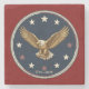 This coaster blends classic Americana with a sophisticated, textured finish. It features a patriotic emblem centered on a natural stone base, making it both a functional piece of barware and a decorative accent. Design Details: Central Imagery: A detailed bald eagle in mid-flight with its wings outspread. The eagle is rendered in gold and brown tones, set against a deep navy blue circular backdrop. Symbolic Accents: A ring of white stars encircles the eagle, framed by a delicate silver-toned border.Color Palette: A bold "patriotic trio" of navy blue, rich crimson red, and gold, accented by the cool grey/white of the natural marble.Material & TextureBase: Crafted from honed marble or tumbled stone, providing a heavy, high-quality feel.Edge Work: The coaster features a distinct deep red border that frames the central seal, giving it a polished, "official" look.Natural Variation: Because it is stone, the edges may have slight, intentional distressing or "weathering," which adds a rustic, antique character to the piece.Product SpecificationsFeatureDescriptionShapeCircularMaterialNatural Marble / Absorbent StoneBackingTypically cork-backed to protect furniture surfacesStyleTraditional, Military-Inspired, or FederalNote: The design strongly resembles motifs used in U.S. government or military seals, making it an ideal gift for veterans, history buffs, or as part of a classic study or office decor.