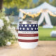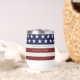 Celebrate the USA with this patriotic wine / coffee tumbler. Design features an American Flag inspired pattern of red and white stripes and white stars. Personalize with 2 lines of custom text. Perfect for a July 4th party, Veterans Day or homecoming or everyday celebration of the USA.