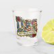 Celebrate this extra special milestone Independence day with an anniversary shot glass. This design features USA in bold red letters with a stars and stripes patterned with additional lettering that says "250 years of freedom." Perfect for celebrating the 250th anniversary of the USA.