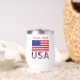 Personalized thermal wine tumbler featuring letters reading USA underneath the American Flag. Add a name to personalize the look or create a gift for Independence Day. The United States flag is red, white, and blue with stars and stripes. Terrific for family reunions, travel groups, and clubs. Fun gift for any occasion or event. Lovely housewarming gift. Design shows on two sides.