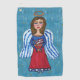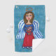 This golf towel is blue covered in little gold stars with a patriotic USA angel with blue eyes and a gold halo in a red white and blue dress holding an USA flag.