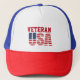 This trucker style hat is shown in red,white and blue with a patriotic USA Flag veteran print.