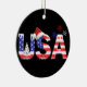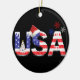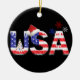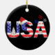 “USA” in the Stars and Stripes with icicles and crystal, a Christmas tree and a Santa hat on “USA”, and snowflakes in red, white, and blue in the background. Unique USA design for the holiday seasons.