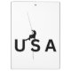American mountain climber using USA letters to descend a rock by abseiling. Black picture on a white background