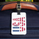 Patriotic American luggage tag has the large letters USA, colored in a red, white, and blue American Flag motif