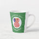 Latte mug for Christmas has an angel dressed in the flag of the United States of America. This USA Flag Angel flies in the center of a white fractal of squiggly squares set in the center of a green fractal of squiggly squares. Add your name, or the name of someone else, if giving as a gift, to personalize. Customize by changing the ?? to a year of your choice. Designed for your Christmas decor this holiday season.