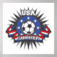 Patriotic USA soccer gear with soccer ball in center with USA upper text and lower soccer text on read white and blue banner!