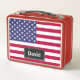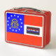 Show your patriotism with this Lunch Box featuring the Municipal Flag of the State of Georgia USA with a licence plate on one side and the Star Spangled Banner with a name licence plate on the other side. The text name can be changed.