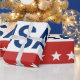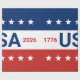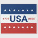 Celebrating the USA's 250th anniversary. This red, white, and blue wrapping paper has the word 'USA' in the center. The years 1776 and 2026 are next to USA. The top stripe is blue and has white stars. The center stripe is white. The bottom stripe is red with white stars.