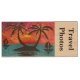 Island scene. Sun setting behind a small island with two palm trees. Red and yellow sky above blue water. Title on cap reads "Travel Photos" in black letters.