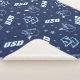 This design showcases a festive pattern with University of San Diego branding. The prominent "USD" logo appears in bold navy blue with light blue shading, along with the stylized "SD" initials at the center. The design features images of the Torero mascot in a dynamic stance, dressed in traditional matador attire, symbolizing school pride. Scattered across the background are navy blue and light blue snowflakes and dots, adding a seasonal and celebratory touch while complementing USD's colors.