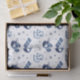 This design showcases a festive pattern with University of San Diego branding. The prominent "USD" logo appears in bold navy blue with light blue shading, along with the stylized "SD" initials at the center. The design features images of the Torero mascot in a dynamic stance, dressed in traditional matador attire, symbolizing school pride. Scattered across the background are navy blue and light blue snowflakes and dots, adding a seasonal and celebratory touch while complementing USD's colors.