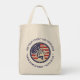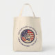 Budget tote bag features Pro Democracy typography graphic of patriotic colored center Liberty Statue badge graphic with circular text that reads "Use your voice, use your vote, save democracy and vote blue.