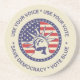Stylish stone coaster features Pro Democracy typography graphic of patriotic colored center Liberty Statue badge graphic with circular text that reads "Use your voice, use your vote, save democracy and vote blue.