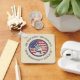 Stylish keychain features Pro Democracy typography graphic of patriotic colored center Liberty Statue badge graphic with circular text that reads "Use your voice, use your vote, save democracy and vote blue.