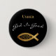 Beautiful blue design with a happy greeting. Church ushers can welcome members of your congregation with a warm message that God Is Good. Design includes a gold ΙΧΘΥΣ (ichthys) with the meaning of Jesus Christ, Son Of God. Stylish button for a Usher. A great way to share faith and ministry.