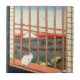 Ukiyo-e print shows a cat sitting on a wall where the sliding panels have been opened, watching the festival procession in the rice paddies nearby, with view of Mount Fuji in the distance.