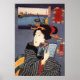 This is a Japanese color print by the artist Utagawa Kuniyoshi (19th century). He created a lot of prints featuring women, and this is another one in the series. In this print we see a Japanese woman, dressed in the traditional Japanese kimono (with a lovely black and white pattern decorating it), while reading a book. Books in Japan in those days were also printed, both the writing and the pictures. Behind her there is a painting (or a print) of what looks like a Japanese fisherman working by the river. Red, blue, yellow, gold and green colors were also used in this artwork. Utagawa signed the print in Kanji characters and Hiragana (Japanese writing).