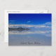 Postcard of the amazing Uyuni salt plains in Bolivia with skyline & mountain reflected in the water covered plains.