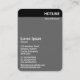 A vertical business card template with a black header with an image on the front. Company name in the header on the front and back with All other contact details on the back. The photo or image on the front can also be changed. The design also allows plenty of scope for additional customization.