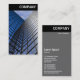 A vertical business card template with a black header with an image on the front. Company name in the header on the front and back with All other contact details on the back. The photo or image on the front can also be changed. The design also allows plenty of scope for additional customization.