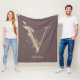 Letter V monogram floral. Letter V in golden brown texture accented with green watercolor compound leaves, flower blossoms and gold dust. Personalized with name in matching font.
