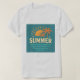 A retro summer design featuring palm trees, ocean waves, and a warm sunset with birds in the sky.