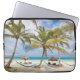 Tropical beach vacation destination with hammocks, beach chairs, and palm trees in Tulum, Mexico.