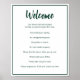 Welcome appears in a dark green script at the top of this house rules poster for a short-term rental house. A short opening statement is below the script. Then there are eight house rules for a short-term rental house. All of the text is dark green. All of the text can be changed to reflect the unique rules for your vacation rental property.