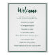 Welcome appears in a dark green script at the top of this house rules poster for a short-term rental house. A short opening statement is below the script. Then there are eight house rules for a short-term rental house. All of the text is dark green. All of the text can be changed to reflect the unique rules for your vacation rental property.