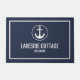Welcome visitors with this nautical anchor vacation rental doormat rug featuring modern typography in white on a navy blue background. Add your vacation rental custom name to this elegant doormat, perfect for a beach cottage, lake house rental or airbnb.