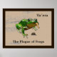 A slightly humorous illustration for Torah portion Va'era in which the first two plagues occur - Nile water is turned to water after which Egypt is overrun frogs. Features the image of a frog with human legs, Pharaoh's, dangling from its mouth and the striped blue and gold headdress which Paroh (Pharaoh) is generally depicted as wearing, discarded on the ground. The image is superimposed on a background resembling the wall of desert ruins. The Egyptian goddess of fertility and childbirth Heket was depicted as a frog or a woman with the head of a frog. On temple walls she was typically in anthropomorphic form, while on amulets Heket was usually in animal form. The frog was an appropriate symbol of fertility as frogs and toads were very common in the Nile delta region. As a plague frogs could thus be seen as foreshadowing the later destruction of Egyptian firstborns.